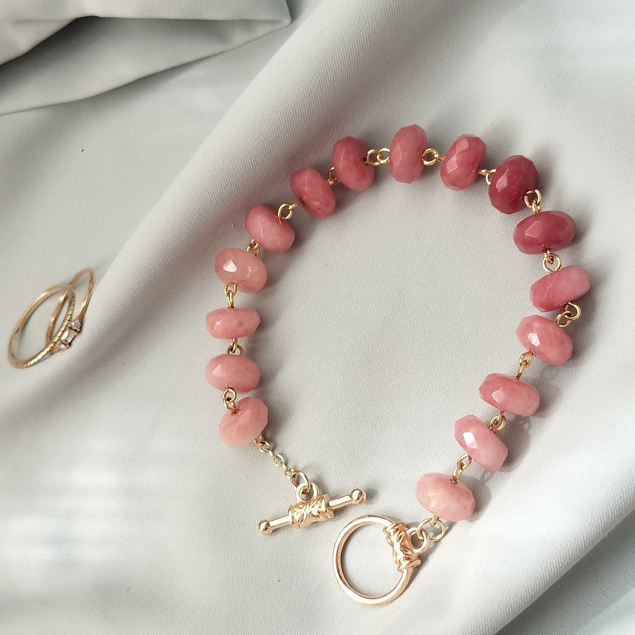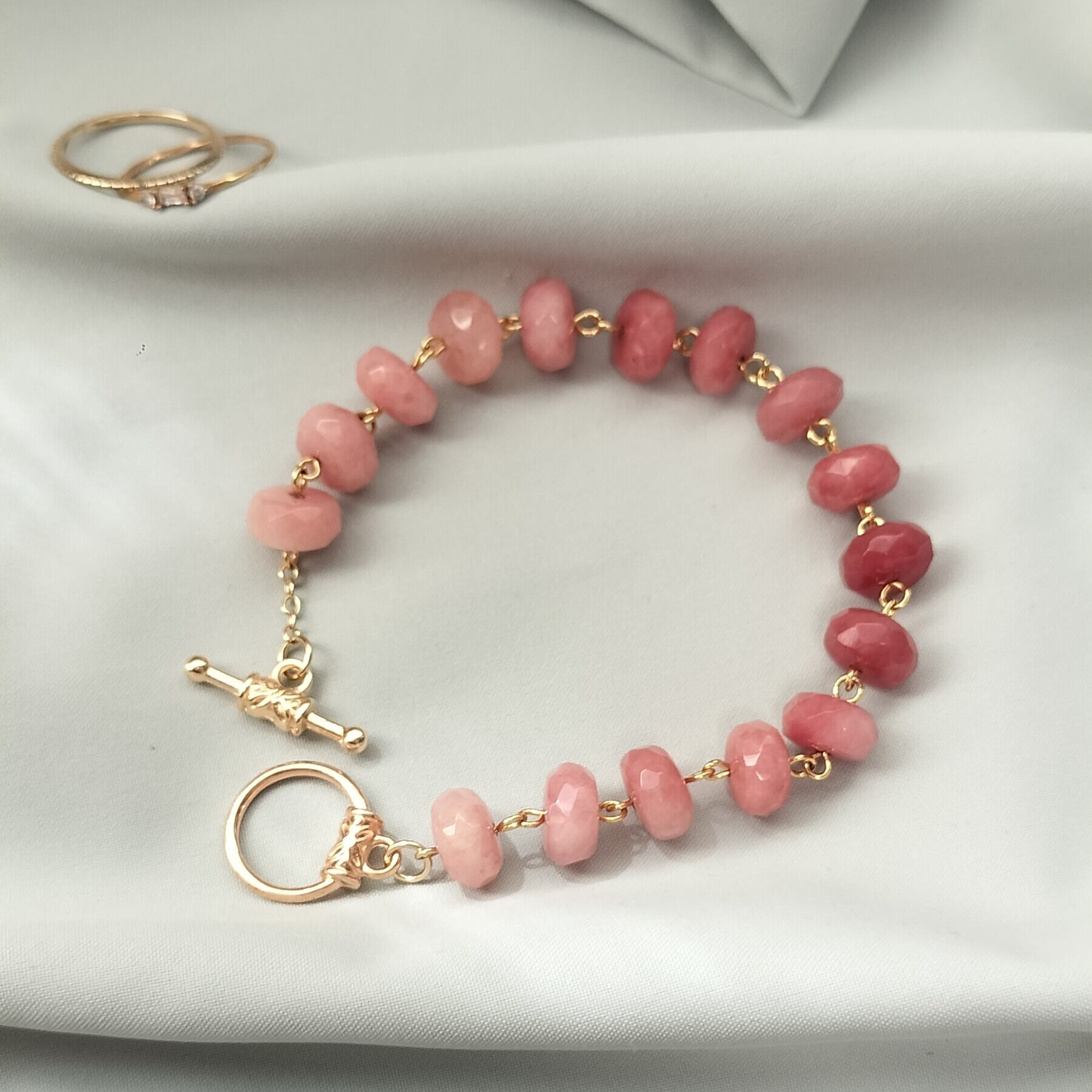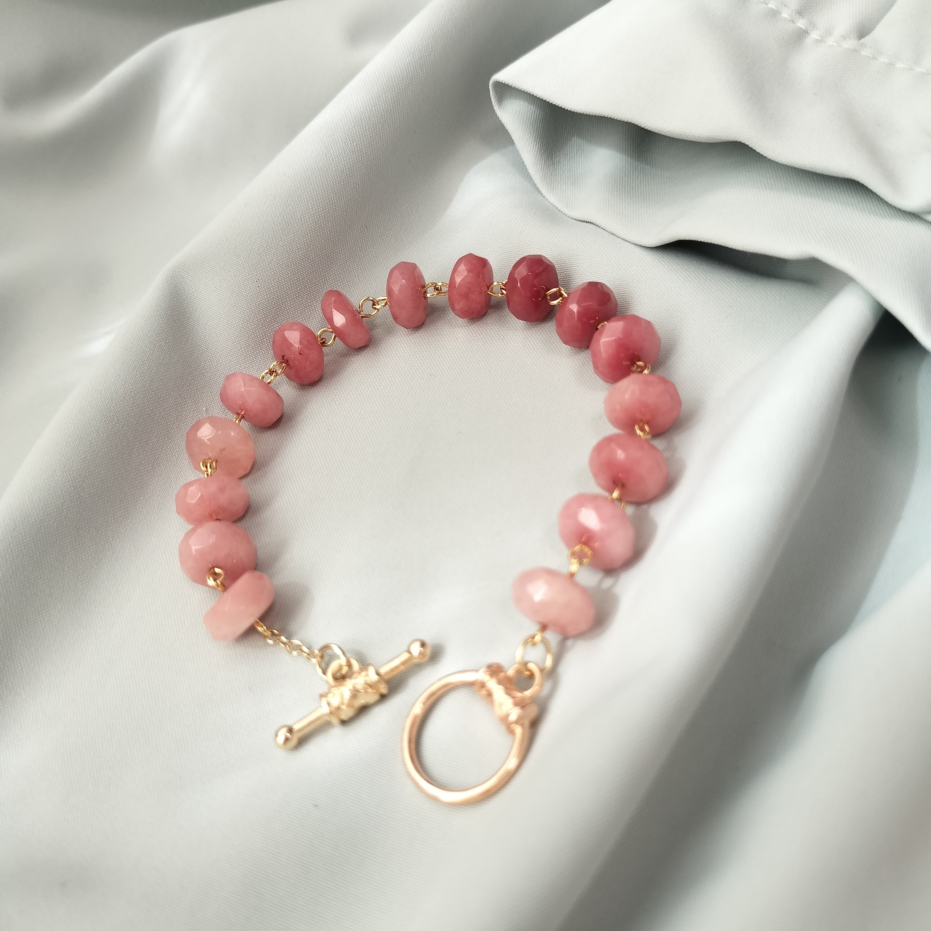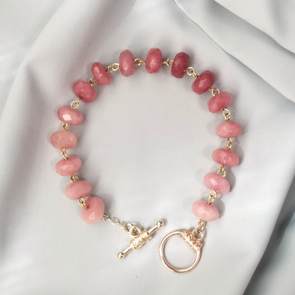 こちらは染めのピンクアベンチュリンを、シンプルに連ねたマンテル金具のブレスレットです。