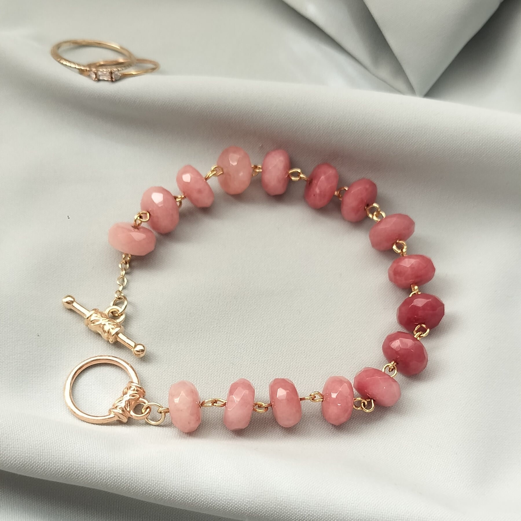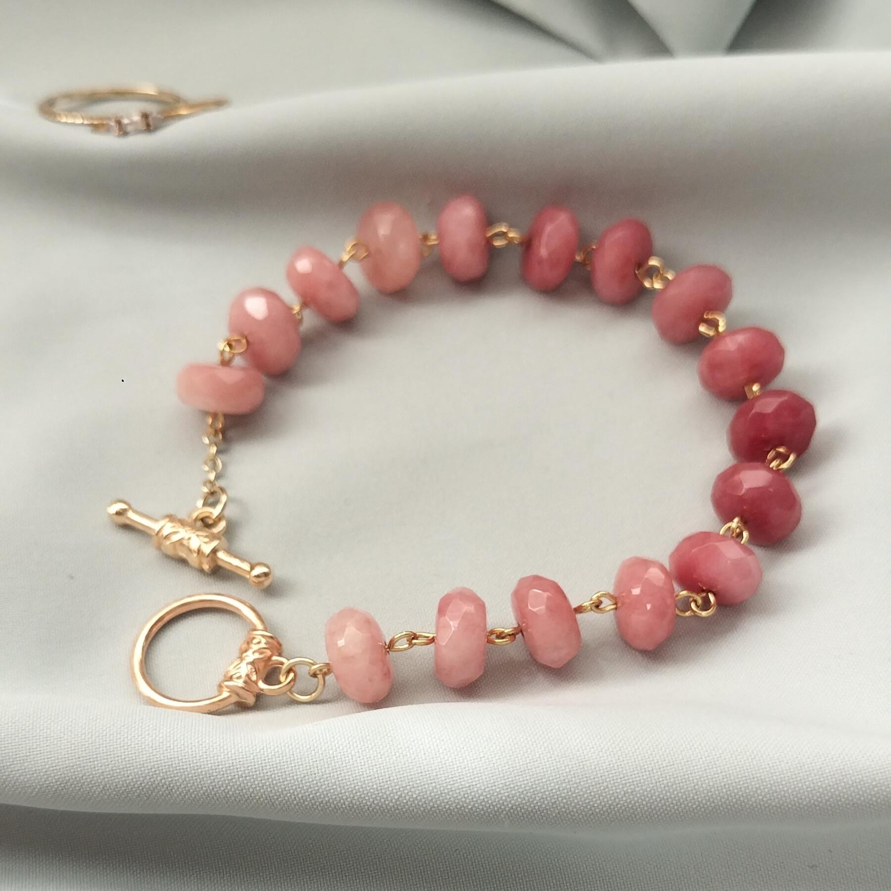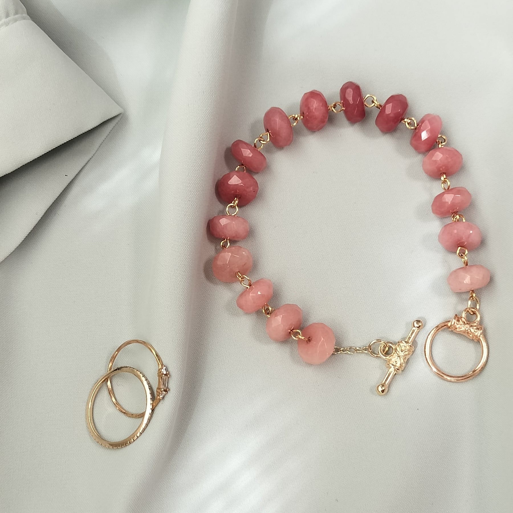 こちらは染めのピンクアベンチュリンを、シンプルに連ねたマンテル金具のブレスレットです。